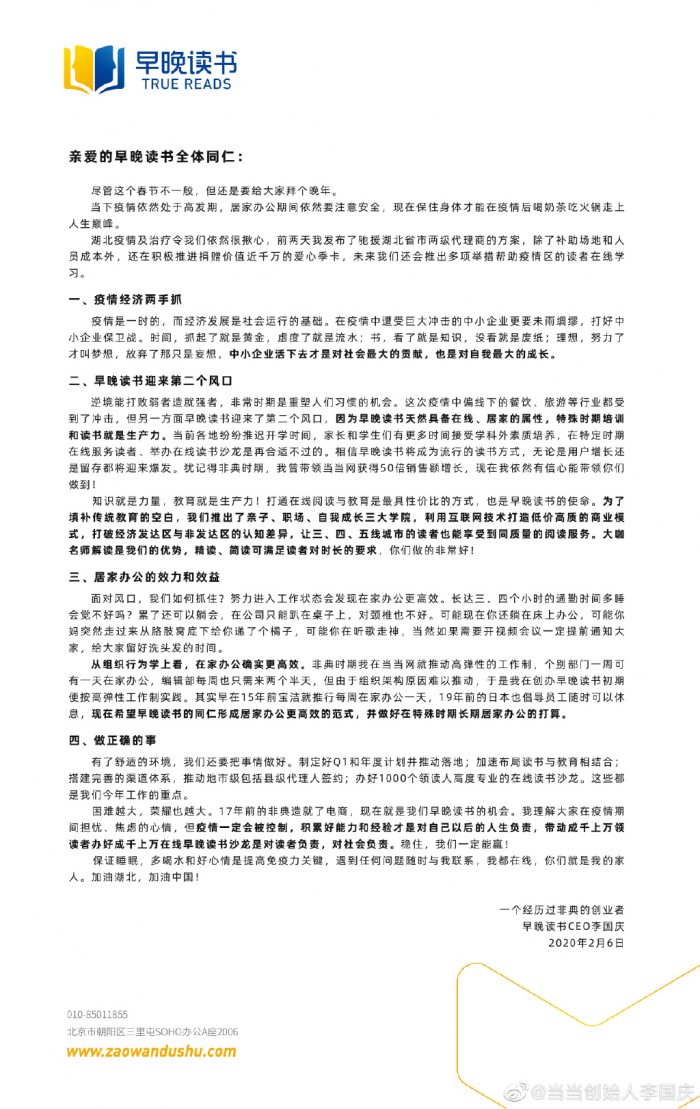 当当网创始人李国庆在日前发布了致早晚读书全员工的内部信。他在内部信中表示,在疫情中遭受巨大冲击的中小企业更要未雨绸缪,打好中小企业保卫战。此外,为了员工和他人安全着想,早晚读书将延迟至20日返京,返京后隔离14天在家办公。