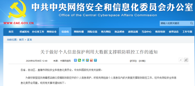 各省、自治区、直辖市网络安全和信息化委员会,中央和国家机关有关部委:为做好新型冠状病毒感染肺炎疫情联防联控中的个人信息保护,积极利用包括个人信息在内的大数据支撑联防联控工作,经中央网络安全和信息化委员会同意,现将有关事项通知如下: