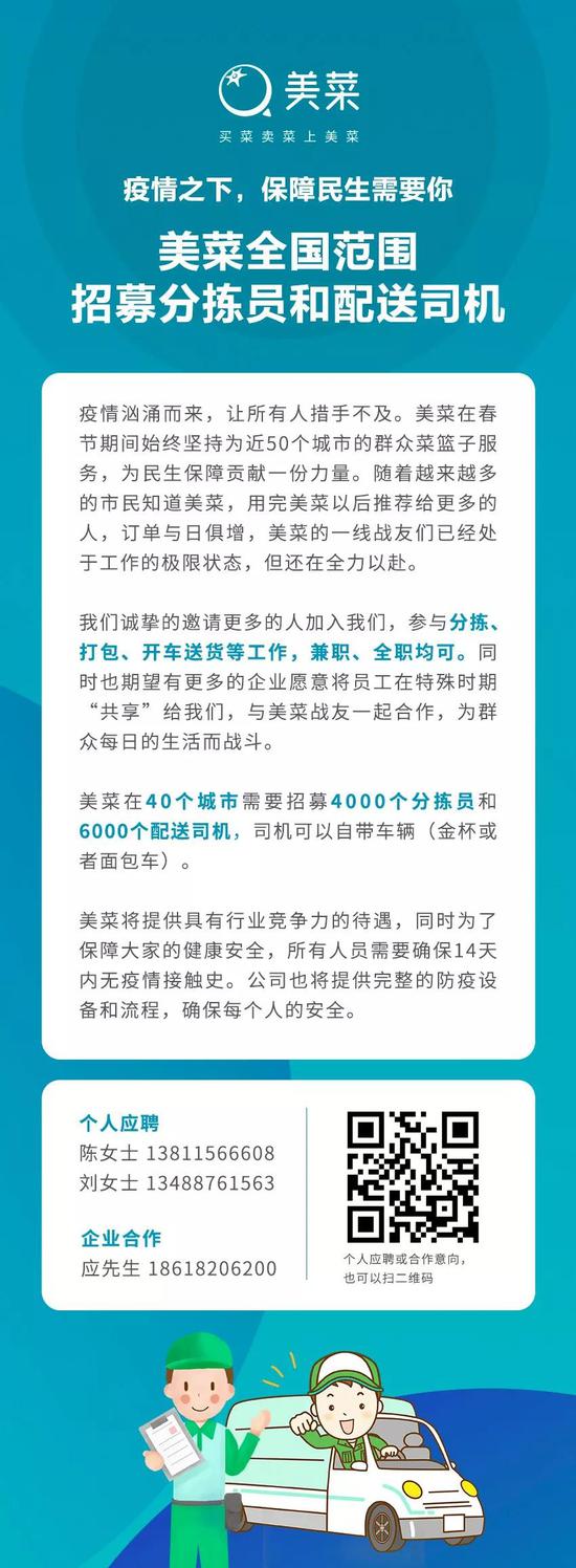 此外,美菜网表示,为了保障健康安全,所有人员需要确保14天内无疫情接触史。美菜将为每一位临时招募的员工提供有竞争力的薪酬待遇,以及完整的防疫设备和流程。
