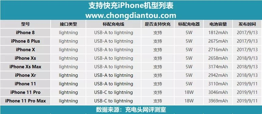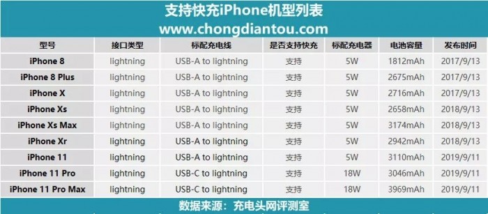 据充电头网统计,目前支持USB PD快充的iPhone机型已经达到9款,苹果在2017年9月也就是iPhone 8以后的所有iPhone机型都支持USB PD快速充电功能,并在今年2019年终于为iPhone 11 Pro、iPhone 11 Pro Max标配了PD配件,在USB PD快充上苹果开始形成强大的阵营。