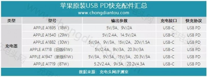 苹果家族目前共有7款USB PD充电器,分别是A1695(18W)、A1540(29W)、A1882(30W)、A1718(61W旧款)、A1947(61W新款)、A1719(87W)、A2166(96W)。这些充电器无论功率大小,经过充电头网实测均能向下兼容iPhone快充。