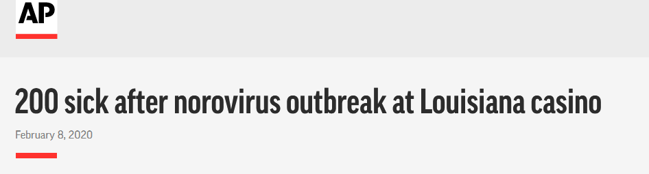 据美联社8日报道,美国路易斯安那州一处赌场近日暴发诺如病毒感染,至少200人患病。路易斯安那州卫生部门官员正展开调查。美联社报道说,该州卫生部门6日确认,在西南部查尔斯湖市(Lake Charles)一家赌场出现的病症与诺如病毒(norovirus)有关。诺如病毒能引起细菌性急性肠胃炎,传染性强,常见症状为腹泻、呕吐。