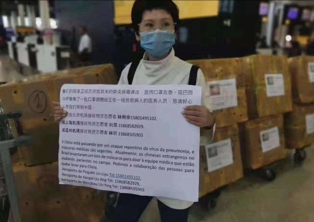 1月31日,一位身在巴西的华人筹到了两万只口罩在机场运不回国,腾蕙和志愿者们联系了回国的领队和个人,成功地帮助他运回了这批物资。