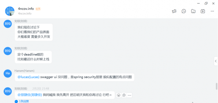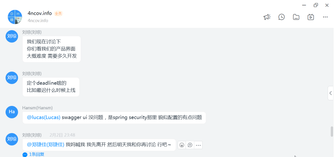 目前4ncov有开发志愿群、后端群、前端群、项目管理群,对外宣传群等组织用于接触志愿者,分配工作和志愿者互动,及时通报项目进度。