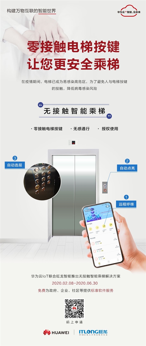 为了阻击病毒在乘梯过程中传播,华为云IoT联合旺龙智能承诺:从即日起到2020年6月30日,向全国各地政府机关、学校、企业、社区等单位,免费提供无接触智能乘梯解决方案的标准软件服务。