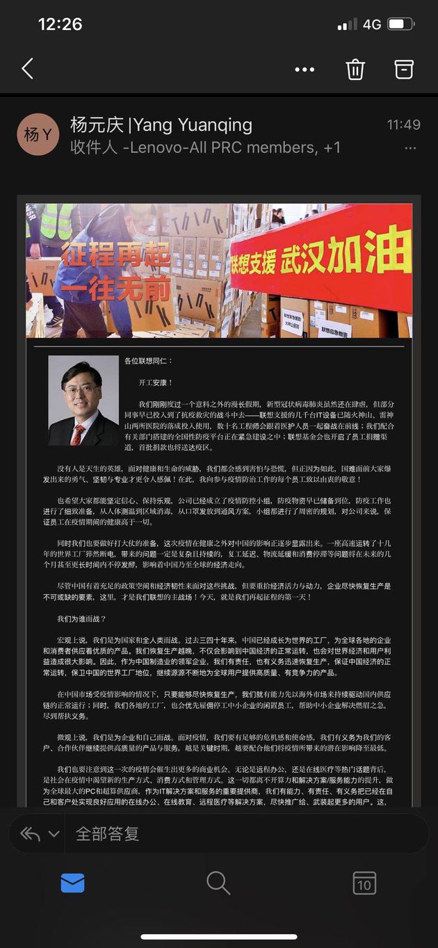 联想人从来都不缺乏斗志和决心,回望过去几年,我们每一次应对危机都能转危为安,并登上新的高峰。我们不仅能温文尔雅、从容不迫,在特殊时期也能成为虎狼之师!前方是我们的战场,公司是我们的后盾!愿诸君一往无前,加油!