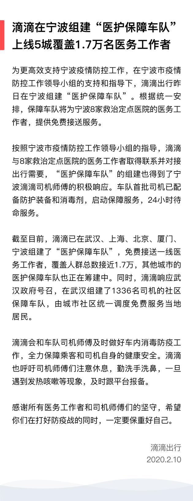 为更高效支持宁波疫情防控工作,在宁波市疫情防控工作领导小组的支持和指导下,滴滴出行昨日在宁波组建“医护保障车队”。根据统一安排,保障车队将为宁波8家救治定点医院的医务工作者,提供免费接送服务。