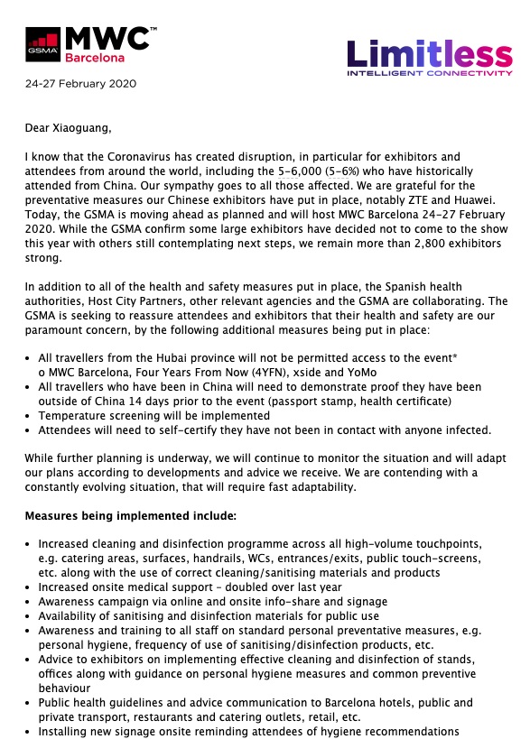 GSMA此前表示,MWC巴塞罗那2020展会进展受到微弱影响,但计划于2月24日至27日如期举办MWC巴塞罗那2020展会。