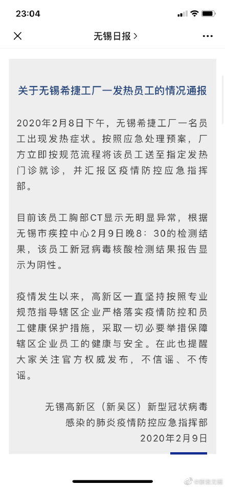 目前该员工胸部CT显示无明显异常,根据无锡市疾控中心2月9日晚的检测结果,该员工新冠病毒核酸检测结果报告显示为阴性,其他密切接触人员也按照规定进行隔离观察。