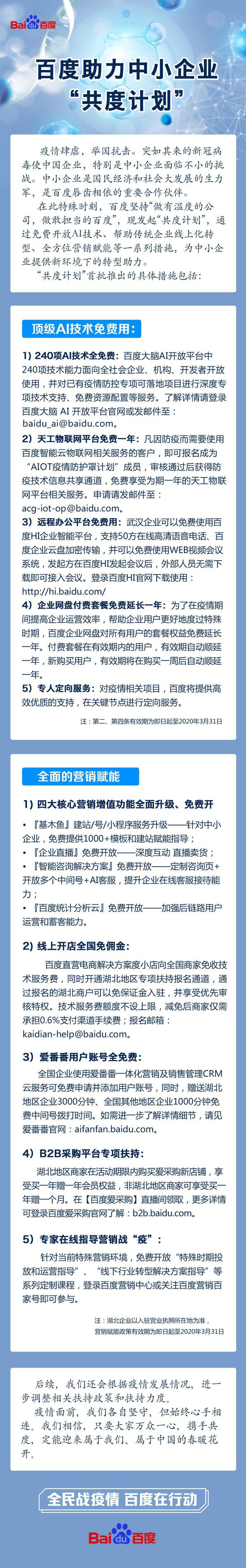 此前,百度免费开放了百度大脑的240项AI技术,供企业、机构和开发者使用,防疫相关项目还可以免费使用天工物联网平台一年;还为武汉企业提供了免费的百度Hi企业智能平台,支持50方在线高清语音电话、百度企业云盘加密传输等服务;百度企业网盘也宣布对所有用户的套餐权益免费延长一年,帮助企业在疫情期间提高运营效率。