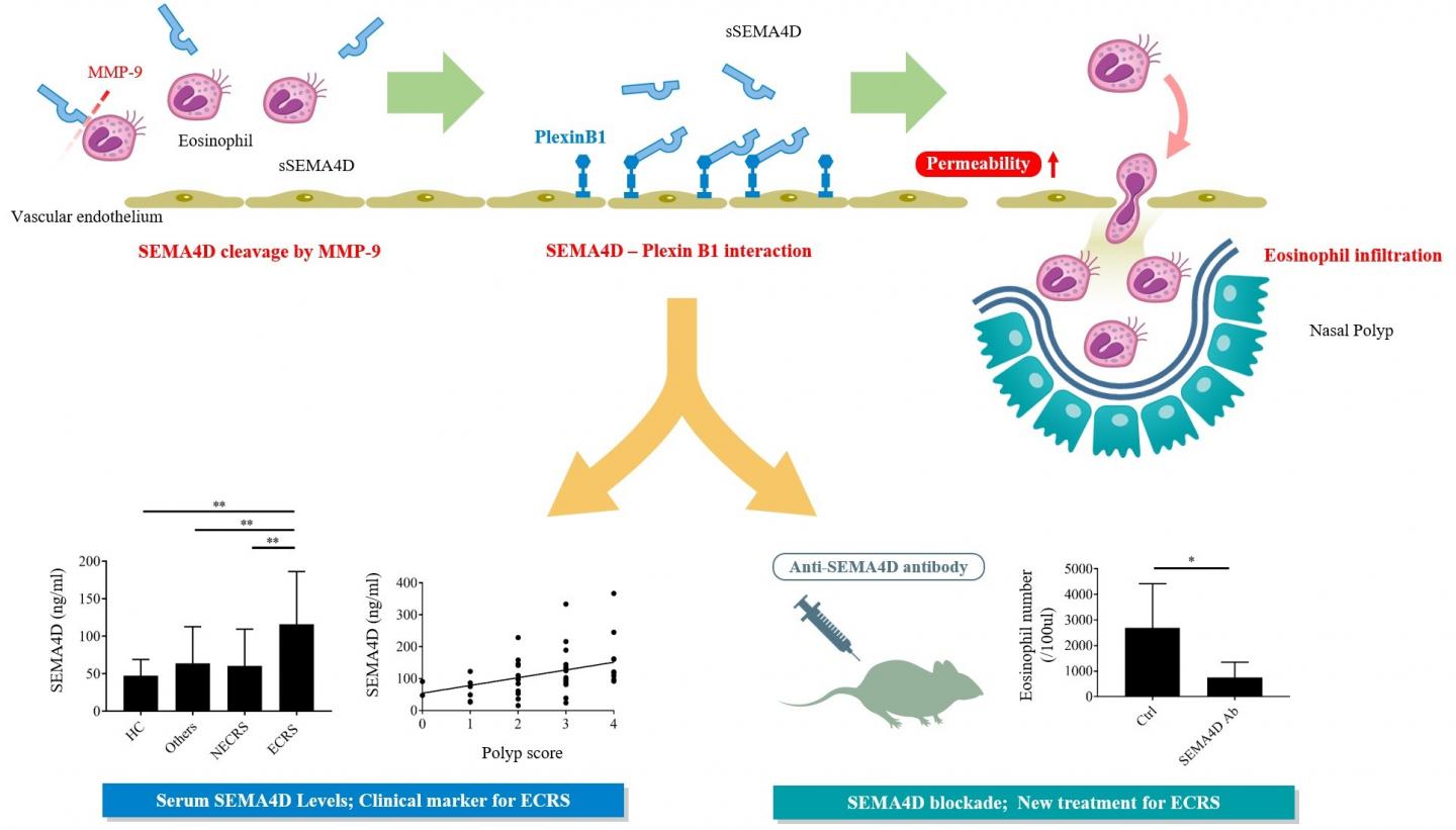 大阪大学的研究小组发现,活化的嗜酸性粒细胞在细胞表面表达高水平的信号蛋白,这种信号蛋白可以通过酶反应释放到周围环境中。这种可溶性的信号蛋白能使嗜酸性粒细胞穿过内皮细胞,导致炎症的发生和鼻息肉的形成。