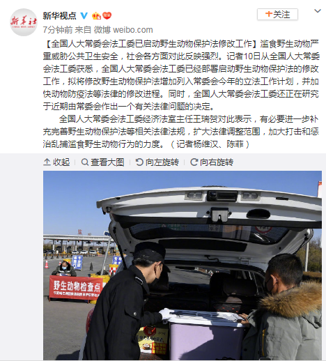 滥食野生动物严重威胁公共卫生安全,社会各方面对此反映强烈。记者10日从全国人大常委会法工委获悉,全国人大常委会法工委已经部署启动野生动物保护法的修改工作,拟将修改野生动物保护法增加列入常委会今年的立法工作计划,并加快动物防疫法等法律的修改进程。