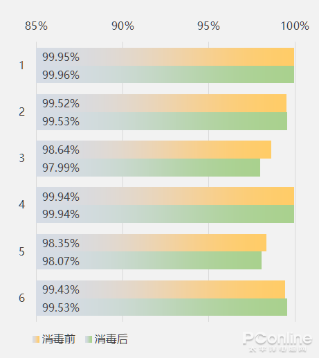 75%酒精(医用酒精):效果最差的一个消毒方法,1、2、5、6号口罩过滤效率都有明显下降。