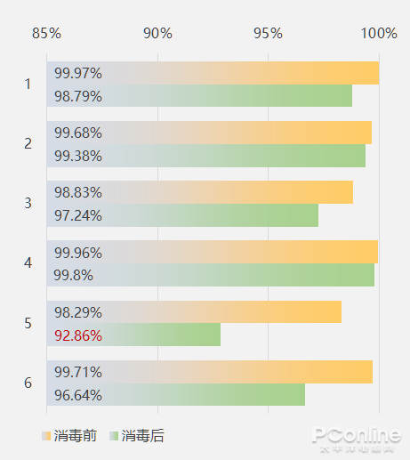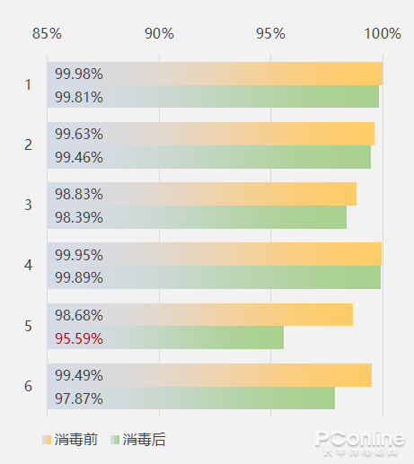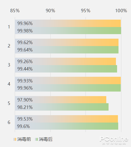 除了高温高压会让口罩变形外,其他方法消毒后口罩普遍都能维持90%以上的过滤效率,只有部分口罩在酒精消毒后过滤效率下降至低于90%。