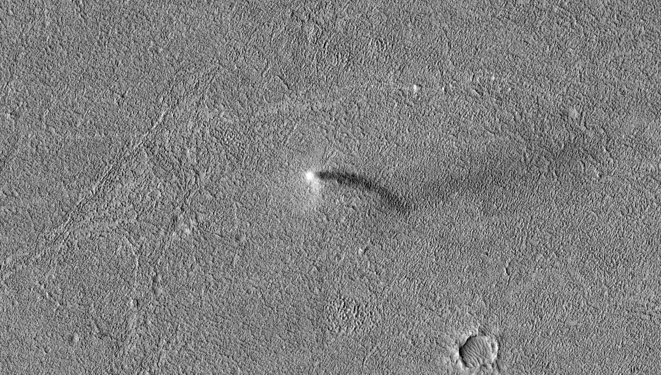 据外媒CNET报道,火星是一个尘土飞扬和多风的世界。当这两种条件同时具备时,可能会导致火星“尘魔”的出现。 美国宇航局(NASA)的火星勘测轨道飞行器(MRO)近日捕捉到了其中一种正在行动的尘魔的罕见画面。亚利桑那大学的MRO HiRise相机团队在周一分享了这张引人入胜的照片。