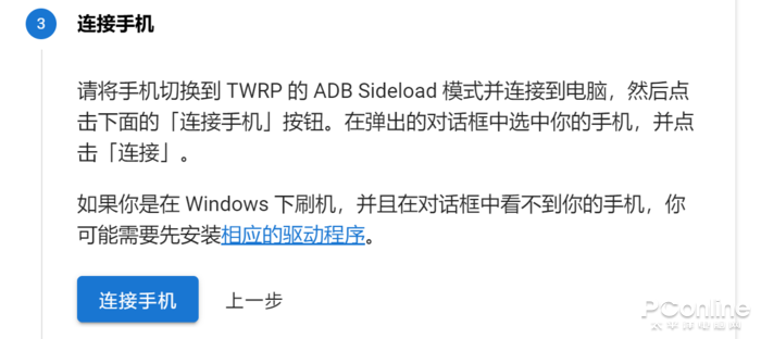 手机需要先启动到TWRP Recovery模式,具体的方法是关机后,同时长按电源键和上音量键开机(不同设备可能不同),然后选择TWRP的ADB Sideload模式,然后将手机和电脑连接。注意,电脑需要安装有相应驱动,相应驱动刷机网页中也有提供。