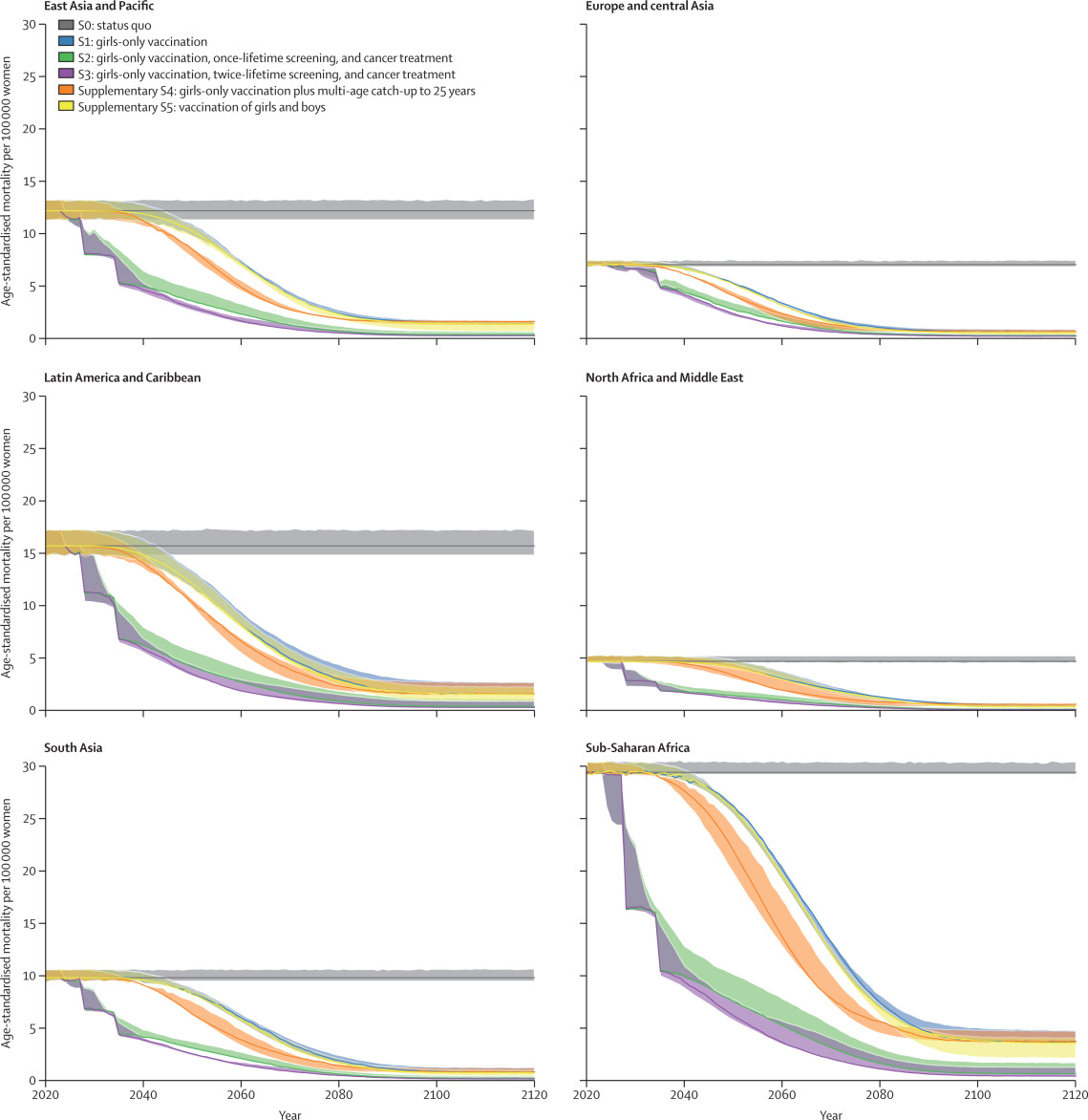 第一项研究预测结果显示,仅疫苗接种一项措施,中低收入国家就可以在下个世纪将宫颈癌病例数减少89.4%,发病率从19.8例/10万人年减少到2.1例/10万人年,从而预防6100万新发病例。
