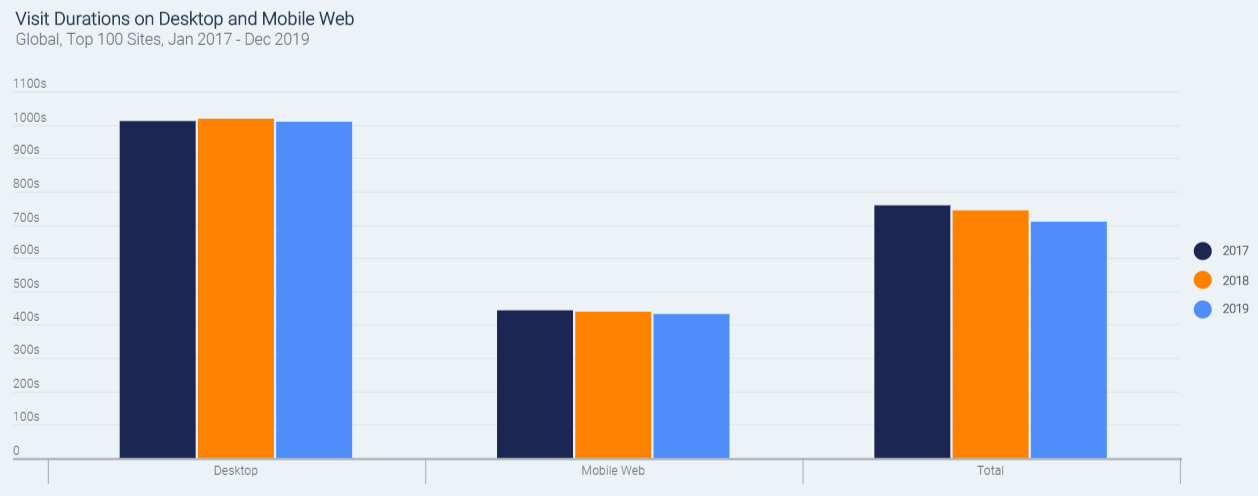 另外有趣的是,用户花在网站上的时间比以前少了。在过去的三年里,无论是手机还是台式机,总访问时间下降了49秒。用户在访问一个网站前的平均停留时间则不到12分钟。