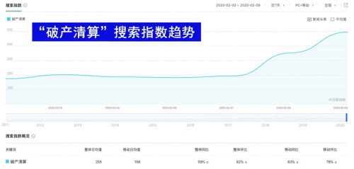疫情对中小企业的影响,更为直观的是,从近7天“破产清算”的搜索指数来看,一路飙升,整体同比上涨59%、环比上涨62%。资讯指数也同样直线上升,环比上涨89%,同比上涨624%。