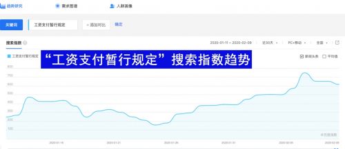 由于疫情导致部分行业无法正常开工,无法复工的员工格外关注“待岗协议”,以此维护自身权益,搜索指数近30天环比上涨130%,同比上涨208%。同时,正因待岗情况的出现,“兼职”在近7天搜索指数也迎来增幅,环比上涨49%。