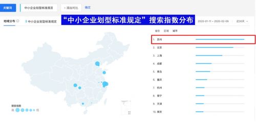 目前,各地纷纷出台中小企业专项扶持政策,正因如此,“中小企业划型标准规定”也随之受到重点关注。百度搜索指数显示,近7天,“中小企业划型标准规定”搜索指数环比上涨334%,同比上涨1379%。在疫情困境下,尽可能满足标准,获得国家扶持,是中小企业极为看重的事项。同时,从搜索地域分布来看,刚出台“十条意见”帮助中小企业纾困的苏州,排名第一。