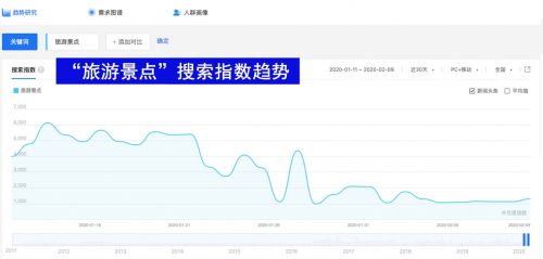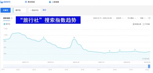旅行行业遇寒冬,“旅行社”、“旅游景点”三十天搜索指数曲线下降明显,分别环比下降40%、54%。