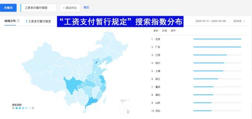 在企业不能正常运行的情况下,员工工资成为中小企业主关注焦点。“工资支付暂行规定”近30天搜索指数曲线呈明显的上线趋势。从地域分布看,北京、上海等一线城市排名靠前,同时武汉、苏州等疫情较为严重地区的中小企业主对该问题也抱有极大关注度。