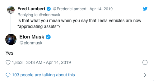 作为著名电动汽车厂商特斯拉的CEO,马斯克提醒购车者燃油汽车的剩余价值在未来几年可能大幅下滑,自然就有电动汽车有更高保值率的意思。