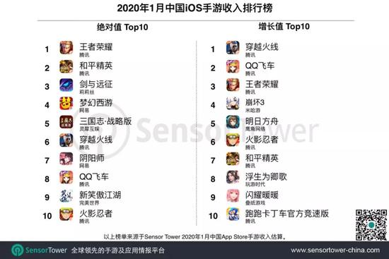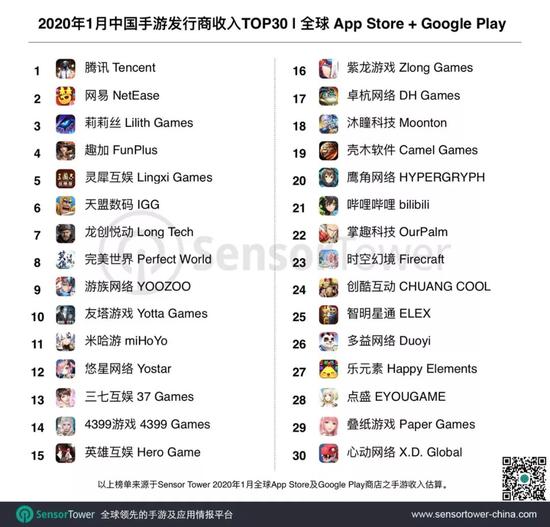 SensorTower商店情报平台发布2020年1月中国手游发行商在全球AppStore和GooglePlay的收入排名榜单。前五名分别是腾讯,网易,莉莉丝,趣加和灵犀互娱。收入情况方面,榜单中30个手游发行商1月全球收入超过15.6亿美元,占当期全球手游总收入28.2%。