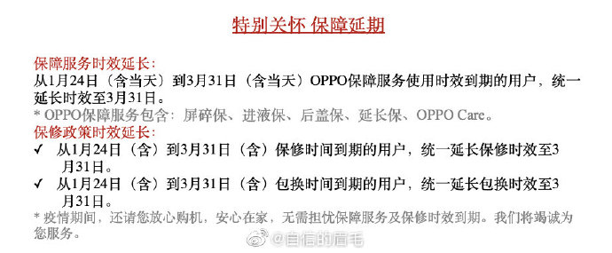 此外,OPPO保修政策时效也将延长,符合条件的用户,保修时间和包换时间均延长至3月31日。更多详细信息以官方通知为准。