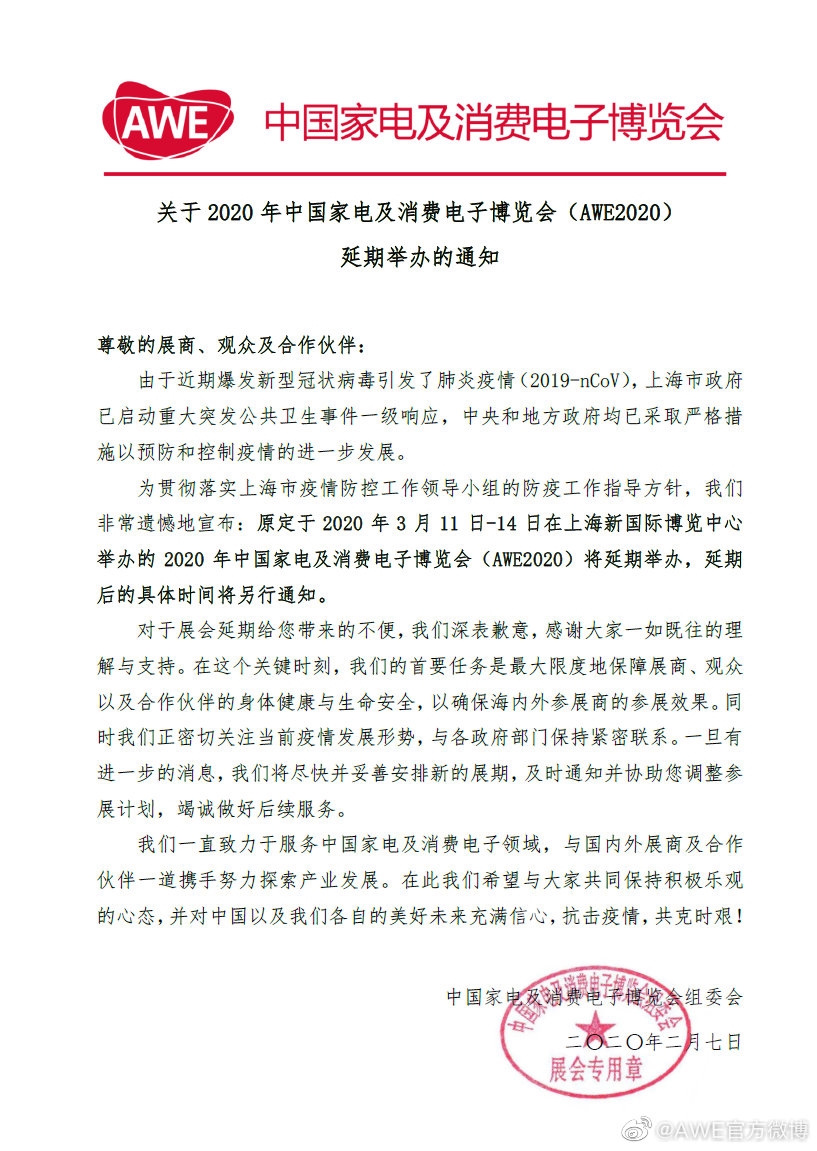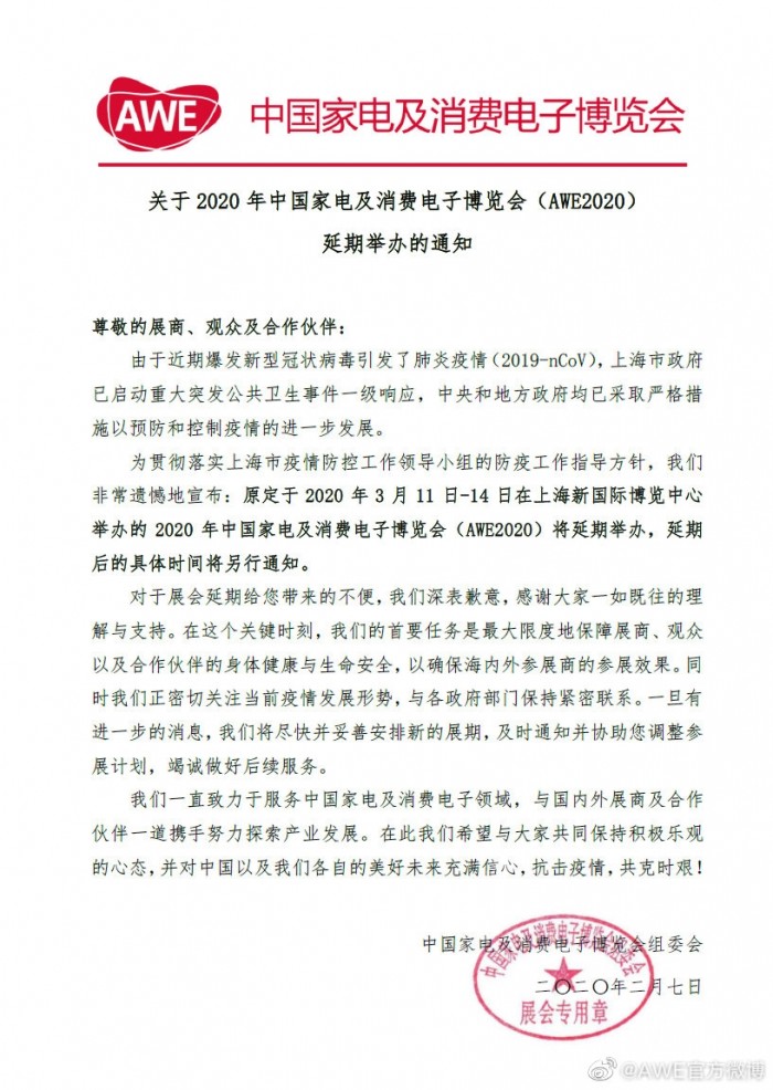 为贯彻落实上海市疫情防控工作领导小组的防疫工作指导方针,我们非常遗憾地宣布:原定于2020年3月11日-14日在上海新国际博览中心举办的2020年中国家电及消费电子博览会(AWE2020)将延期举办,延期后的具体时间将另行通知。