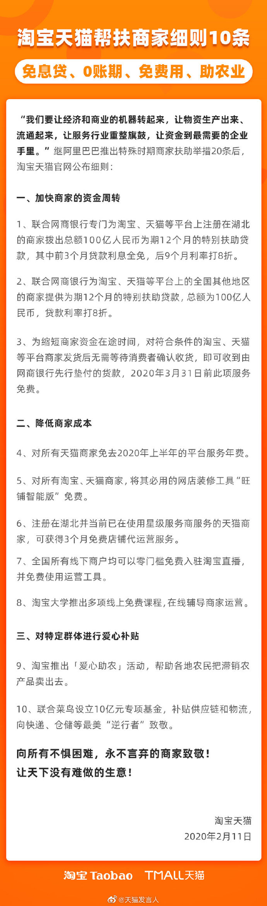 2月11日下午消息,继2月10日阿里巴巴推出20条商家扶助举措后,2月11日淘宝公布相应细则:设立总额200亿元、为期12个月的特别扶助贷款。商家在网商银行申请贷款后,可享受8折贷款利率。其中100亿针对湖北地区商家,前3个月只需要还本金,不需要1分钱利息。