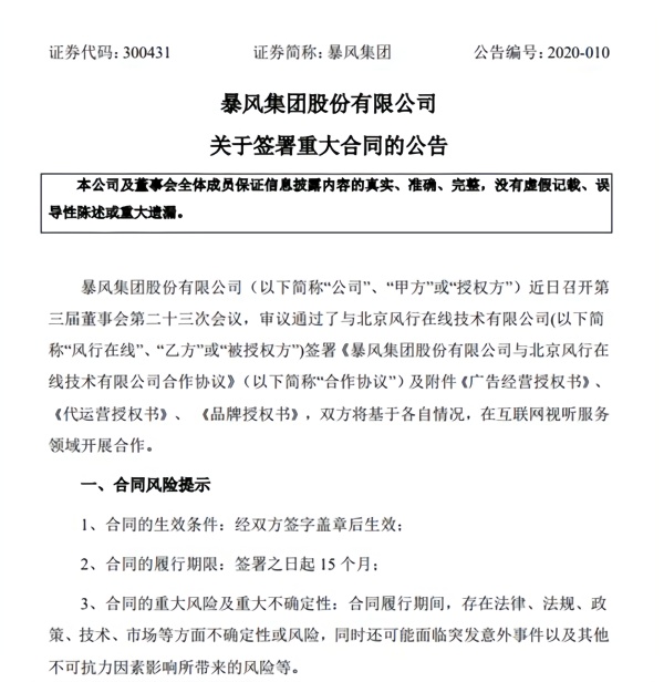 从这次的公告来看,暴风确实是跟风行达成了合作,将品牌、运营及广告等授权给了风行在线,换句话说后者确实没完整收购暴风,但获得了暴风授权接手品牌及运营。