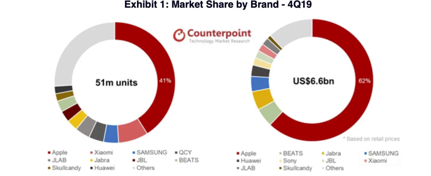 根据Counterpoint Research的最新数据,预计苹果将继续在全球市场中占据主导地位,到2020年将售出超过1亿个真正的无线听觉设备。Counterpoint在今天发布的一份报告中表示,真正的无线听觉设备全球市场规模超出了预期,与去年同期相比,2019年第四季度增长了53%。