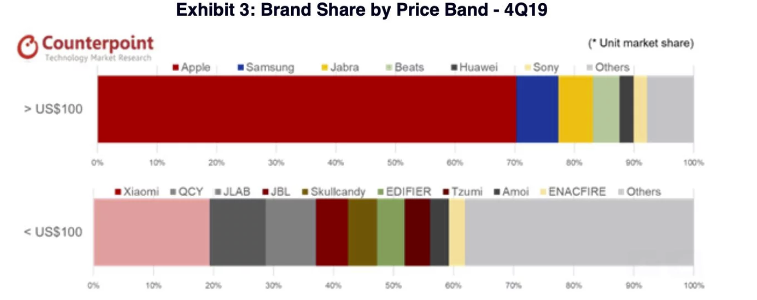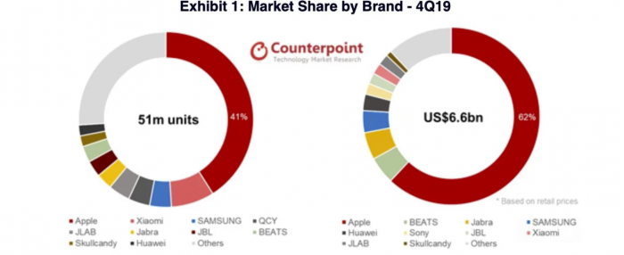 无线听觉设备该季度共售出5100万台,而全年售出1.3亿台。美国市场是该季度的主要推动力,同比增长76%,占全球市场的35%。苹果于10月底推出的AirPods Pro,帮助该公司在去年第四季度创下了44%的稳定增长,尽管供应短缺,但销量却达到了600万部。苹果试图保持快速的整体市场增长,其市场份额环比微跌至41%,全年市场份额达到47%。