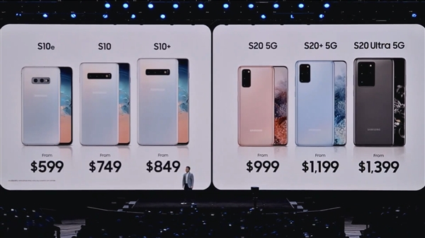 价格方面,S20 128GB 5G 999美元/4G 899美元、S20+ 128GB 5G 1199美元/4G 1099美元、S20+ 512GB 5G 1299美元/4G 1199美元、S20 Ultra 128GB 1399美元、S20 Ultra 512GB 5G 1499美元。