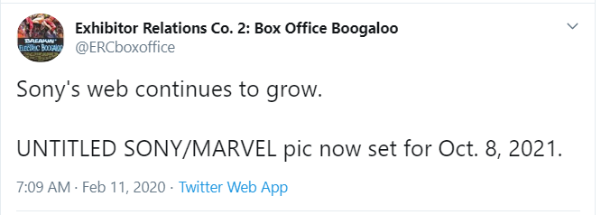 索尼今日确定了新漫威电影的上映日期:2021年10月8日。目前尚不清楚这部电影是谁。索尼拥有蜘蛛侠和大量相关角色的版权,此前索尼曾和漫威合作推出了两部以荷兰弟为主角的《蜘蛛侠》电影:《蜘蛛侠:英雄归来》和《蜘蛛侠:英雄远征》,这两部电影都设定在漫威电影宇宙中。