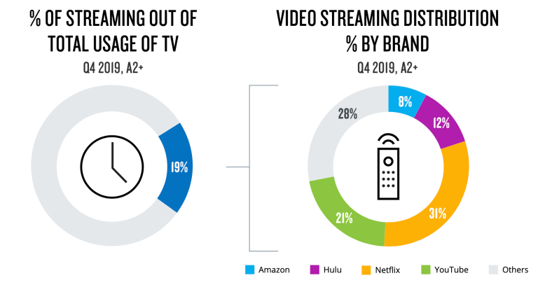该报告指出,在订阅OTT服务的家庭中,2019年第四季度期间有19%的电视时间用于观看流媒体内容。毫不奇怪,Netflix是这些服务中最受欢迎的选择,占观看时间的31%。其次是YouTube(21%),Hulu(12%)和Amazon(8%)。其他服务占28%。