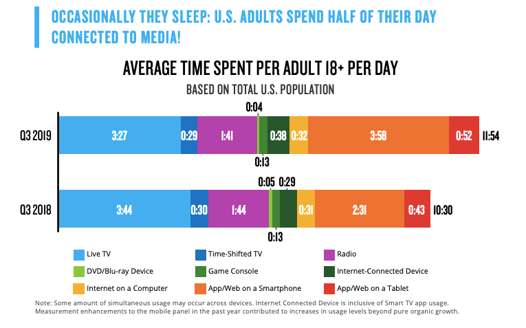 如今,美国消费者似乎比以往任何时候都更加沉迷于自己的设备,平均每天消费者花费11个小时54分钟与电视、智能手机、游戏机等进行互动。在大部分时间(3小时58分钟)中使用应用程序或通过智能手机访问网络,然后是观看直播电视(3小时27分钟)。与去年相比,美国消费者在数字媒体内容上多花费了近90分钟。