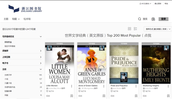 近日,浙江图书馆宣布200种世界文学经典(英文版)一年内无限畅读。美国OverDrive赛阅公司向浙江图书馆捐赠最受全球读者欢迎、排名前200的世界文学经典英文原著电子书(全部经过国家授权电子书进口机构审核),不限复本量,免费开放,期限1年。