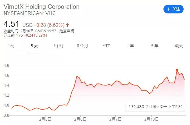 扭过头来看 VirnetX 这边,因为又一次在法庭上战胜了苹果,股价小涨了 10% 。