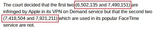 而在苹果的这场诉讼里,VirnetX 控告苹果侵犯了其第 6502135、7490151、7418504 和 7921211 号共四项专利,最后法官判定苹果侵犯了前两项专利。