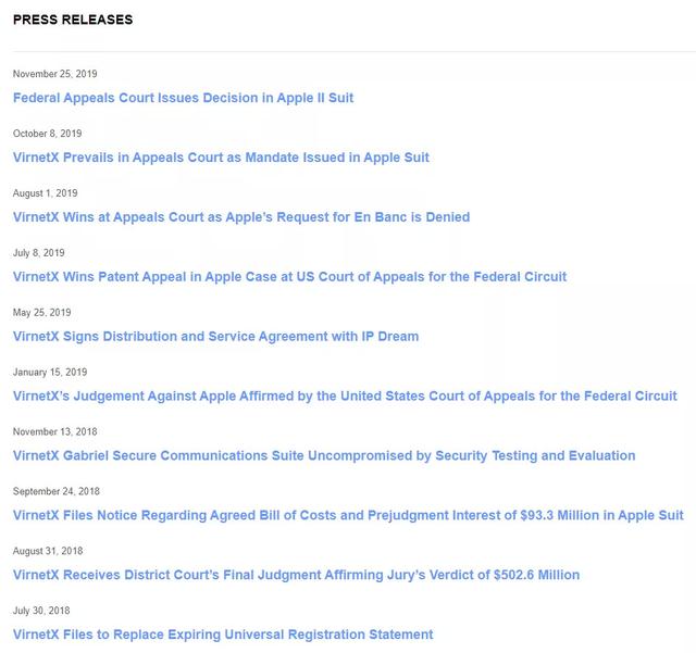在 VirnetX 的官方上,有一个官方新闻稿板块,差评君浏览完了全部 146 条新闻之后发现,里面的大部分内容都是“ 我们申请了 XX 专利 ”、“ 我们向 XX 发起了诉讼 ”又或者是“ 我们跟 XX 的官司打赢啦 ”。