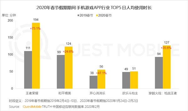 用户的使用时长也随之水涨船高,人均单日使用时长增长17.8%。其中《王者荣耀》较去年春节期间增长近75%,从111分钟增加到194分钟,《和平精英》也从99分钟增加到124分钟。