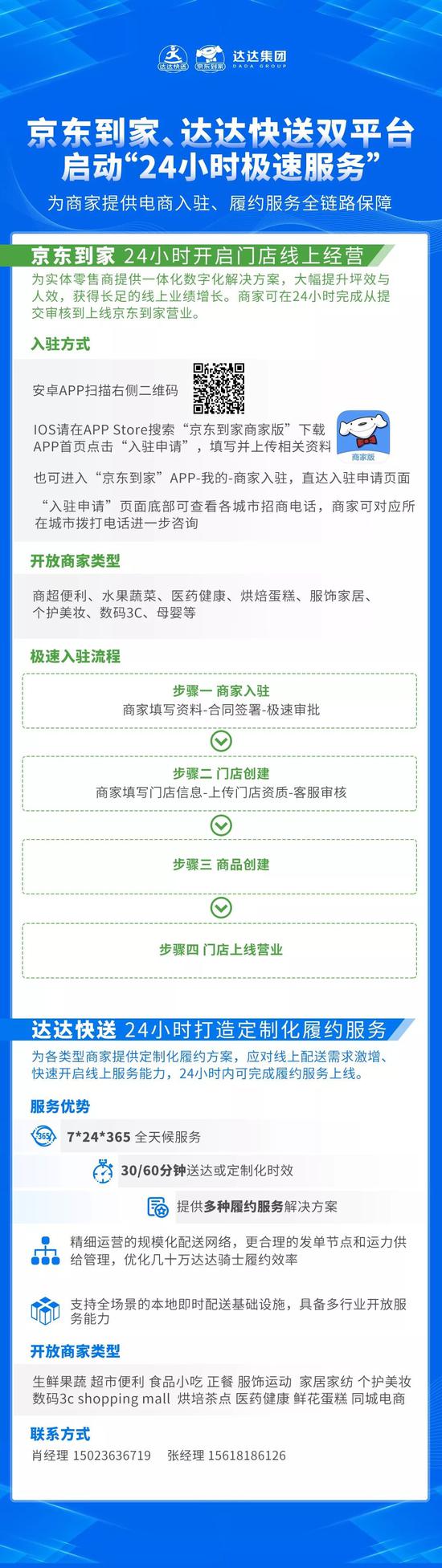 达达快送也开通24小时极速服务,24小时内可完成履约服务上线,为各类型商家打造定制化履约方案,应对特殊时期线上配送需求激增、快速开启线上服务能力。有意向的商家可拨打招商合作电话:肖经理 15023636719,张经理 15618186126。
