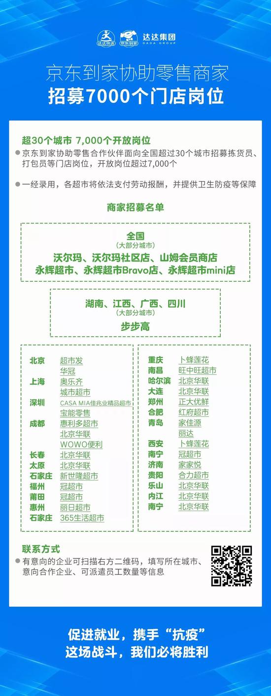 为了帮助中小企业纾困,全力支持稳就业、保民生工作,达达集团宣布,旗下京东到家平台将协助零售合作商家,面向全国超过30个城市招募拣货员、打包员等门店岗位,开放岗位超过7000个。一经录用,各超市将依法支付劳动报酬,并提供卫生防疫等保障。