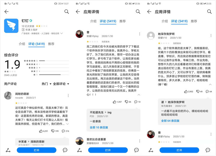 据用户和一些业内人士称,阿里钉钉、科大讯飞、好视通、Zoom 课堂、一师一优课等支持平台都出现了不同程度的卡顿甚至“崩溃”。而钉钉,更是因此,被“口吐芬芳”的学生们,凭一己之力打出了“新高度”——华为应用市场显示,钉钉目前评分 1.3 分,共计 4 万 2 千余条评分,其实中 3 万 9 千多一星评分,均为近期涌入。