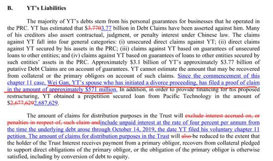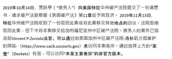 申请离婚两天后,贾跃亭便在美国主动申请个人破产重组,同时设立债权人信托,并在条件满足的时候把全部在美国资产转让给债权人。根据贾跃亭债务处理小组当时的声明,贾跃亭90%以上的债务都是替公司担保的债务,直到去年10月13日,减去已冻结待处置国内资产以及可转股的担保债务,贾跃亭债务净额约为20亿美金。