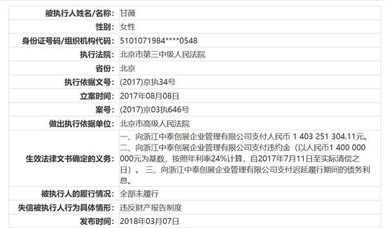 受贾跃亭牵连,甘薇在2018年因一笔14.3亿元的债务,成为失信被执行人,至今仍未解除,债权方浙江中泰创展公司穿透后是中国民营资本系族之一的“中植系”。