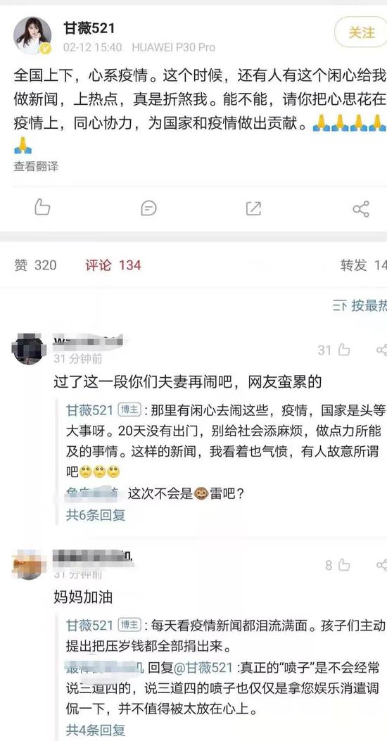 40亿天价离婚索偿会让贾老板“雪上加霜”吗?2月12日下午,贾跃亭的妻子甘薇发微博:“全国上下,心系疫情。这个时候,还有人有这个闲心给我做新闻,上热点,真是折煞我。能不能,请你把心思花在疫情上,同心协力,为国家和疫情做出贡献。”疑似回应前不久传出的其向贾跃亭索偿约5.71亿美元(约合人民币40亿元)天价离婚案。